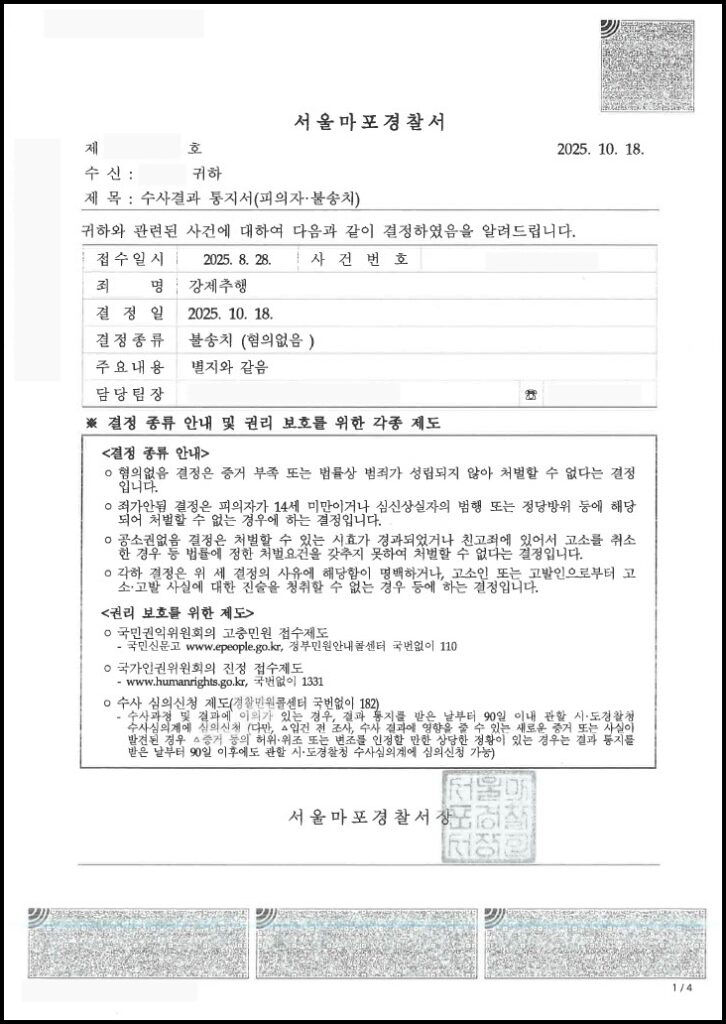 법무법인 온강의 신속한 증거보전 신청을 통해 확보된 객관적인 CCTV 영상과 이를 바탕으로 전개된 치밀한 법리적 주장을 경찰 수사기관이 전적으로 받아들였습니다. 경찰은 피의사실을 입증할 증거가 불충분하다고 판단하여, 의뢰인에게 제기된 강제추행 혐의에 대하여 최종적으로 불송치(혐의없음) 결정을 내렸습니다. 의뢰인은 억울한 형사 처벌의 위기에서 벗어나 명예를 회복하였습니다.