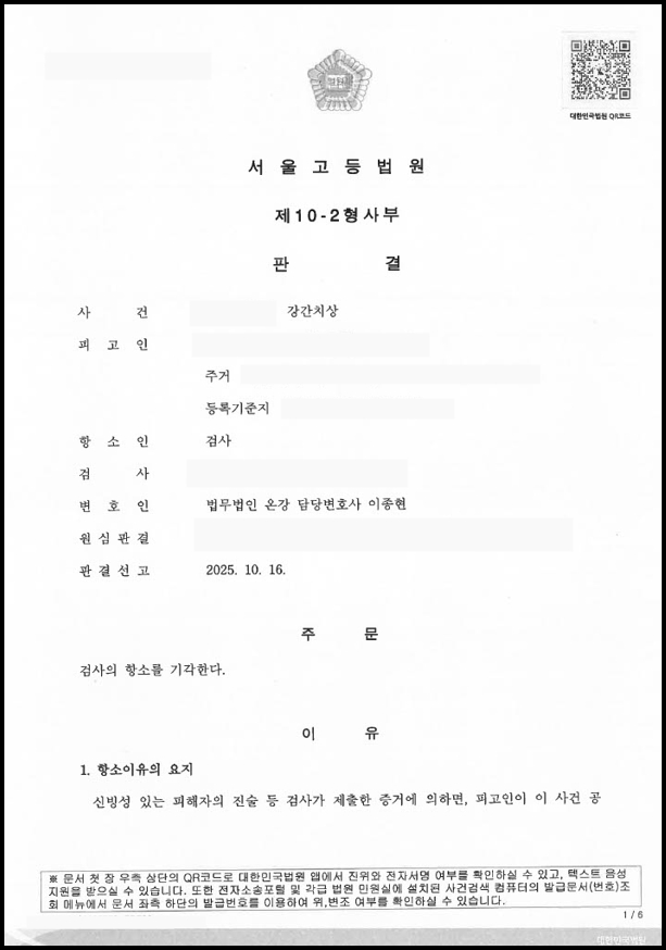 항소심 재판부는 법무법인 온강의 변론을 모두 받아들여, “원심의 판단을 뒤집을 만한 새로운 증거나 특별한 사정이 없다”고 판시하며 검사의 항소를 기각하였습니다. 이로써 의뢰인은 1심에 이어 항소심에서도 무죄를 선고받아, 강간치상이라는 무거운 혐의를 완전히 벗고 비로소 평온한 일상을 되찾을 수 있었습니다.