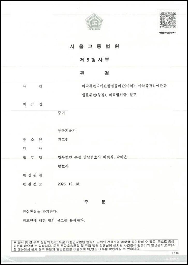 서울고등법원은 온강의 항소 이유를 받아들여, 징역 1년에 집행유예 2년을 선고했던 원심판결을 파기하고 의뢰인에게 [선고유예] 판결을 내렸습니다.