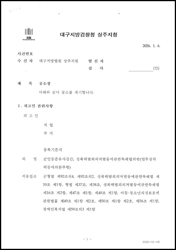 검찰은 법무법인 온강의 의견을 적극 수용하여 가해자의 죄질이 매우 불량하고 증거가 명백하다고 판단했습니다. 그 결과, 가해자는 군인등준유사강간 및 업무상위력등에의한추행 등의 혐의로 불구속 기소(구공판) 되어 재판에 넘겨졌습니다.