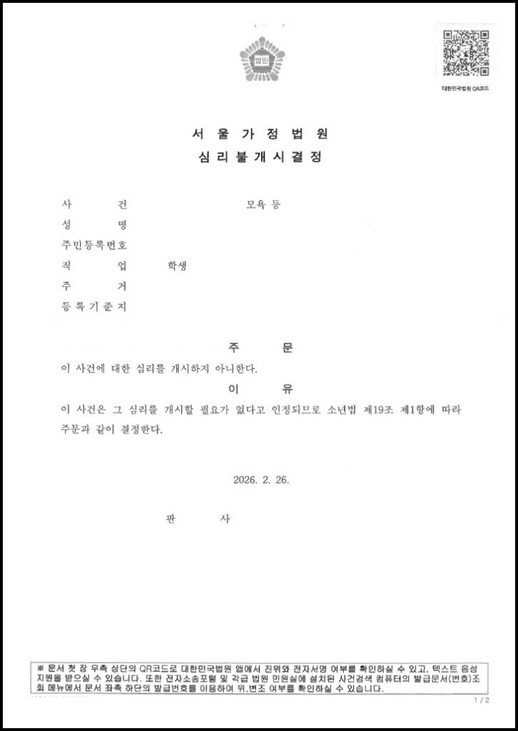 이러한 법무법인 온강의 치밀한 법리 다툼과 객관적 증거 탄핵을 통해, 법원은 온강의 주장을 타당하다고 받아들여 의뢰인에게 보호소년 심리불개시결정을 내렸습니다. 이로써 의뢰인은 억울한 혐의와 무거운 처벌의 위기에서 벗어나 평온한 학교생활로 돌아갈 수 있었습니다.