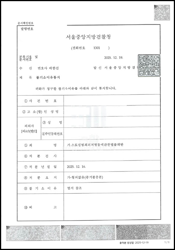 서울중앙지방검찰청은 법무법인 온강의 변호인 의견서 내용을 전적으로 수용하여 ‘혐의없음(증거불충분)’ 처분을 내렸습니다.