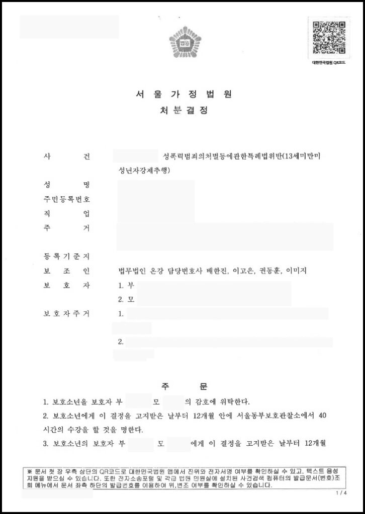 그 결과, 재판부는 온강의 주장을 받아들여 소년분류심사원 위탁 등 무거운 처분을 피하고, 보호처분 1호(보호자 감호 위탁) 및 2호(수강명령 40시간)라는 관대한 처분을 내렸습니다.