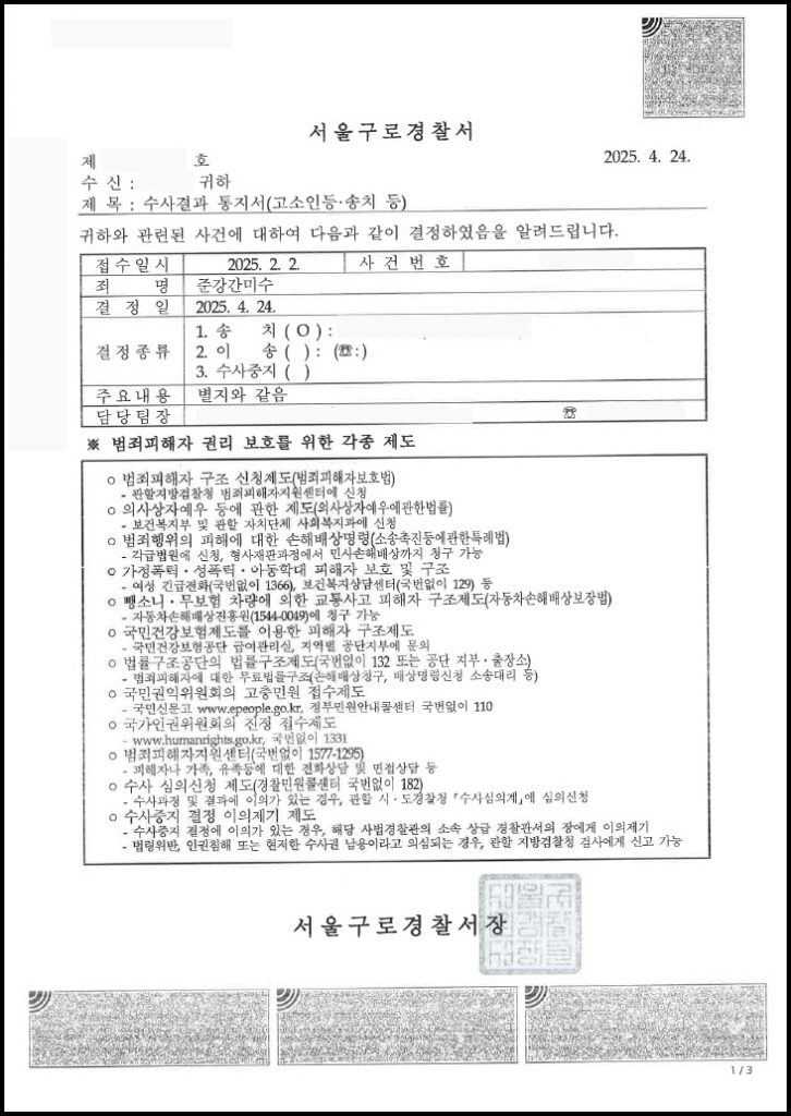 의뢰인이 전문직 종사자이며 건전한 사회생활을 영위하고 있음을 입증하는 자료를 제출하여, 의뢰인이 금전적 이득을 위해 피해 사실을 허위로 꾸며낼 이유가 전혀 없음을 강조했습니다. 또한, 이 사건으로 인해 의뢰인이 겪고 있는 외상 후 스트레스 장애, 직장 및 일상생활의 어려움 등 극심한 정신적 고통을 자세히 기술하여 피의자에 대한 강력한 처벌(엄벌)의 필요성을 검찰에 강력히 피력하였습니다.