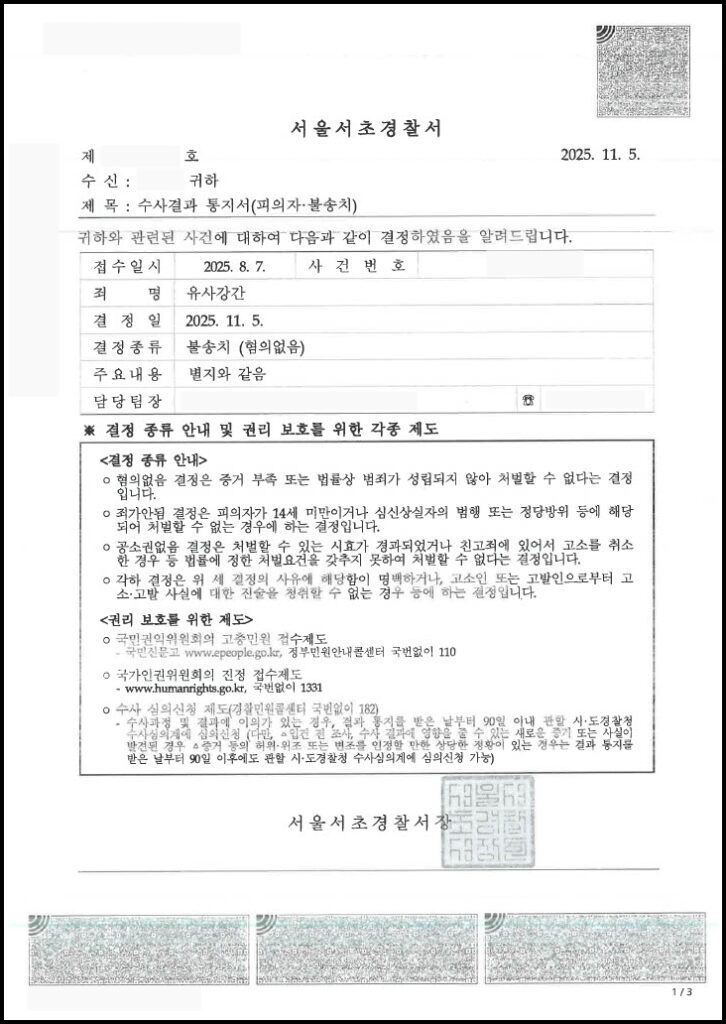 경찰은 법무법인 온강의 주장을 대부분 받아들여, 피해자 진술의 신빙성이 부족하고 혐의를 입증할 객관적 증거가 없다는 이유로 의뢰인에 대해 ‘불송치(혐의없음)’ 결정을 내렸습니다. 이로써 의뢰인은 억울한 누명을 벗고 소중한 일상으로 복귀할 수 있게 되었습니다.