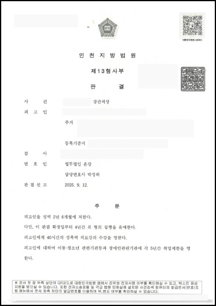 인천지방법원은 법무법인 온강의 주장을 받아들여, 피해자와 합의하지 못한 점 등 불리한 정상에도 불구하고 의뢰인의 진심 어린 반성과 피해 회복 노력을 참작하여 징역 2년 6개월에 집행유예 4년을 선고하였습니다.